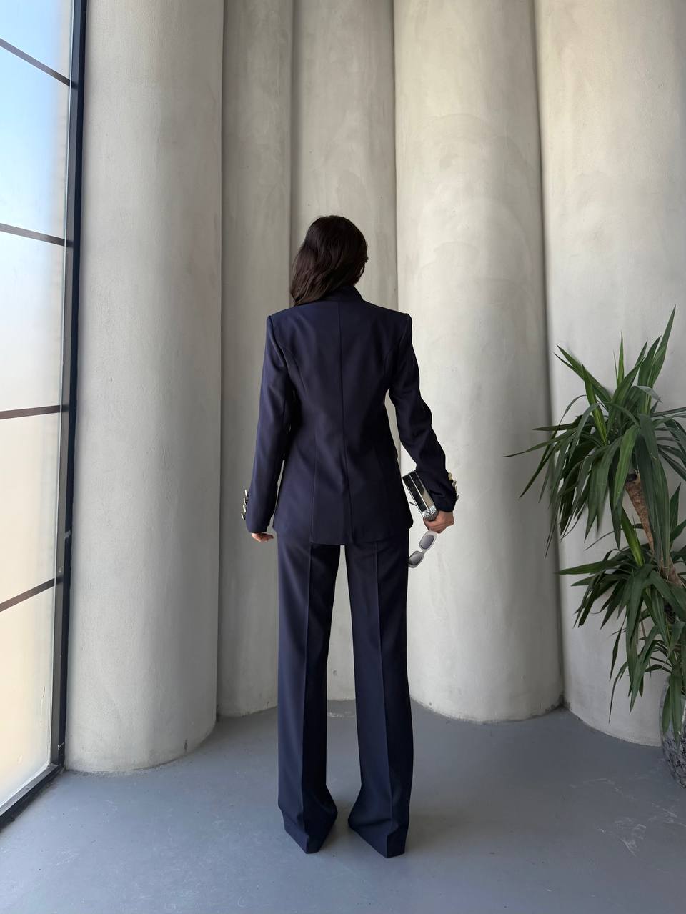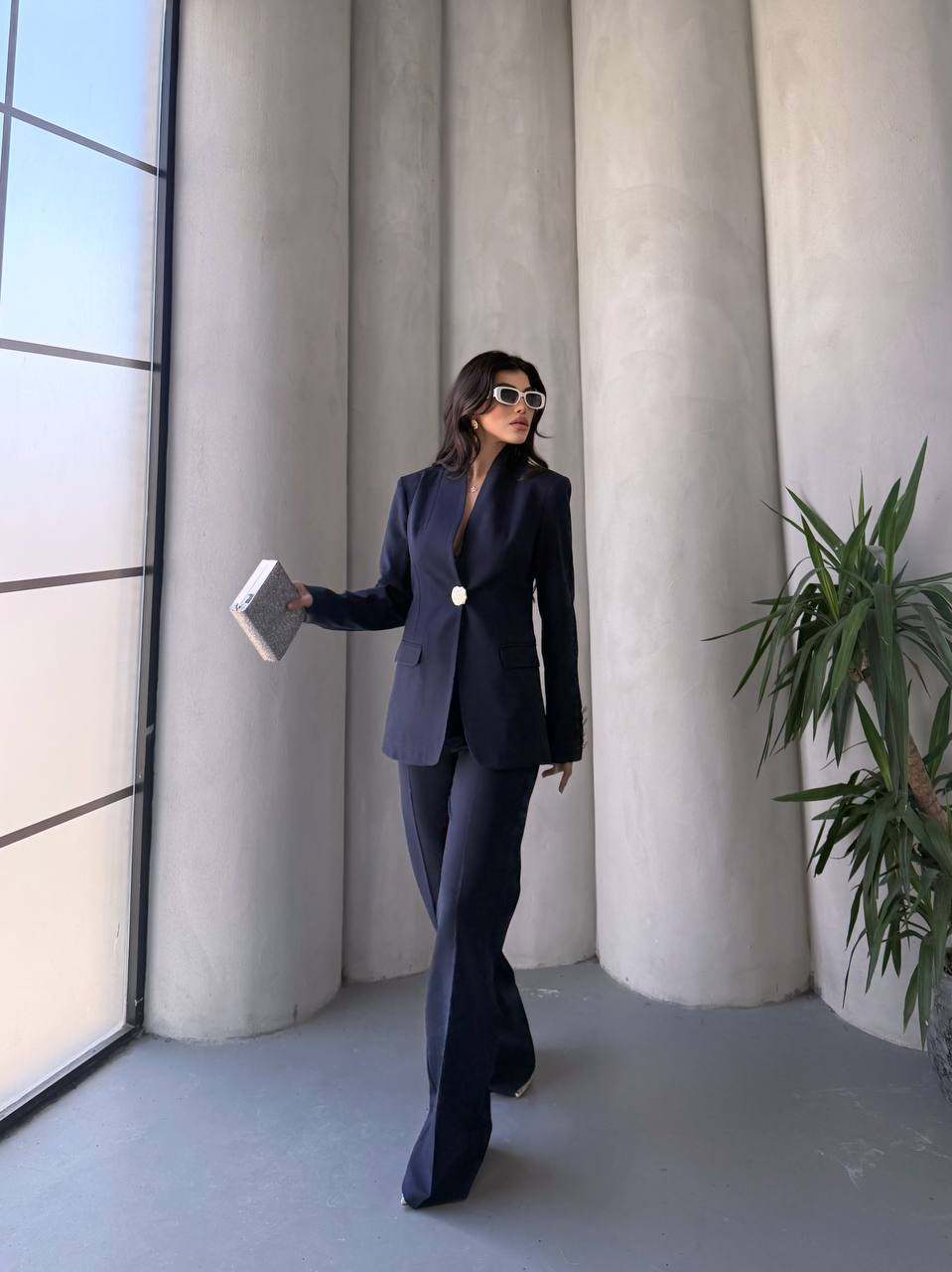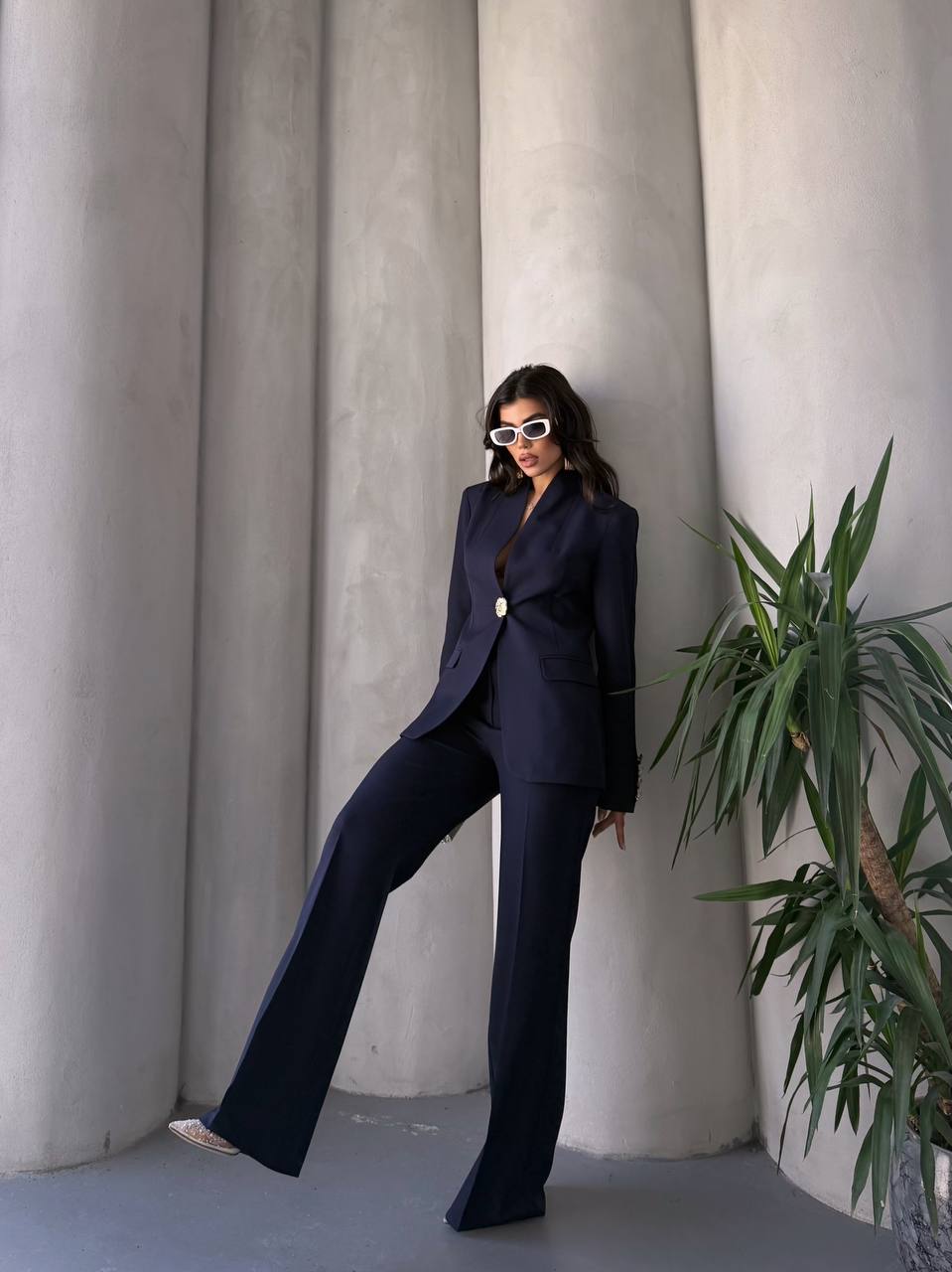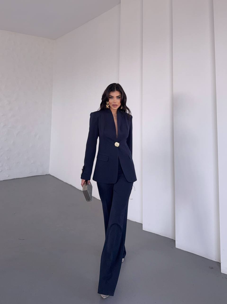 Blazer ceket ve bol paça pantolon ikilisinden oluşan kadın takım elbise. Astarlı, zarif ve rahat kesimiyle ofis şıklığı ve özel davetler için ideal. S-XL beden seçenekleriyle keşfet!