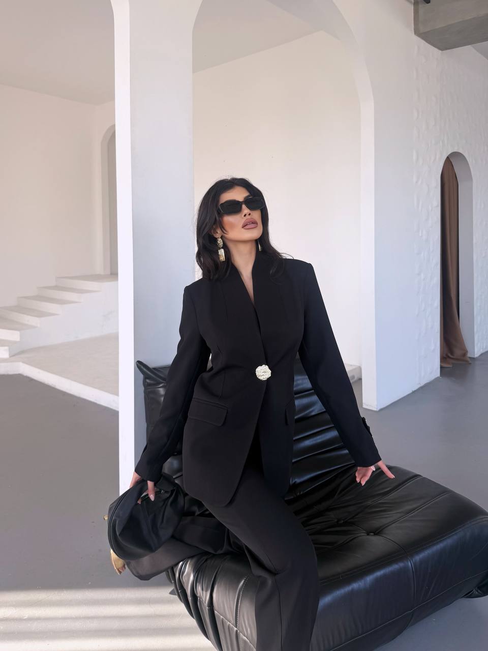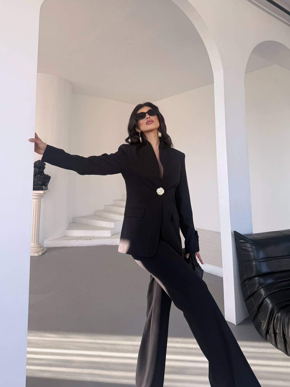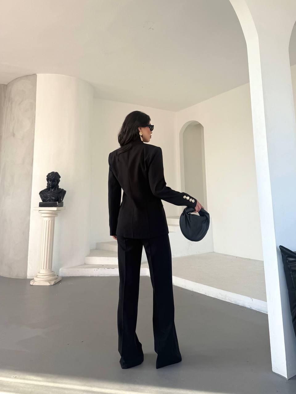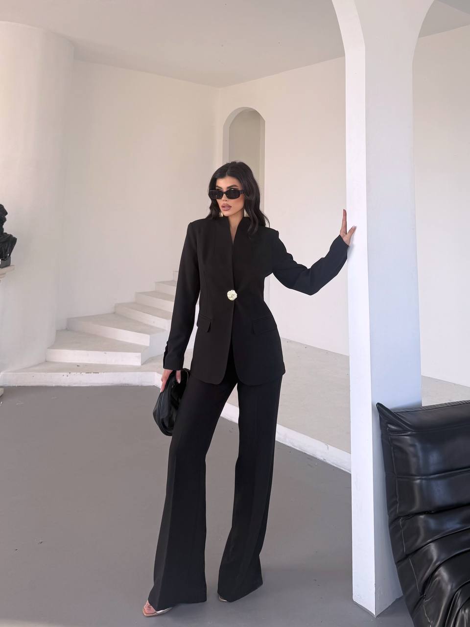 Blazer ceket ve bol paça pantolon ikilisinden oluşan kadın takım elbise. Astarlı, zarif ve rahat kesimiyle ofis şıklığı ve özel davetler için ideal. S-XL beden seçenekleriyle keşfet!