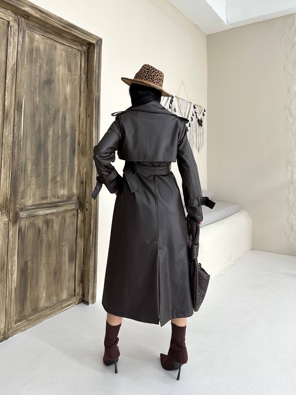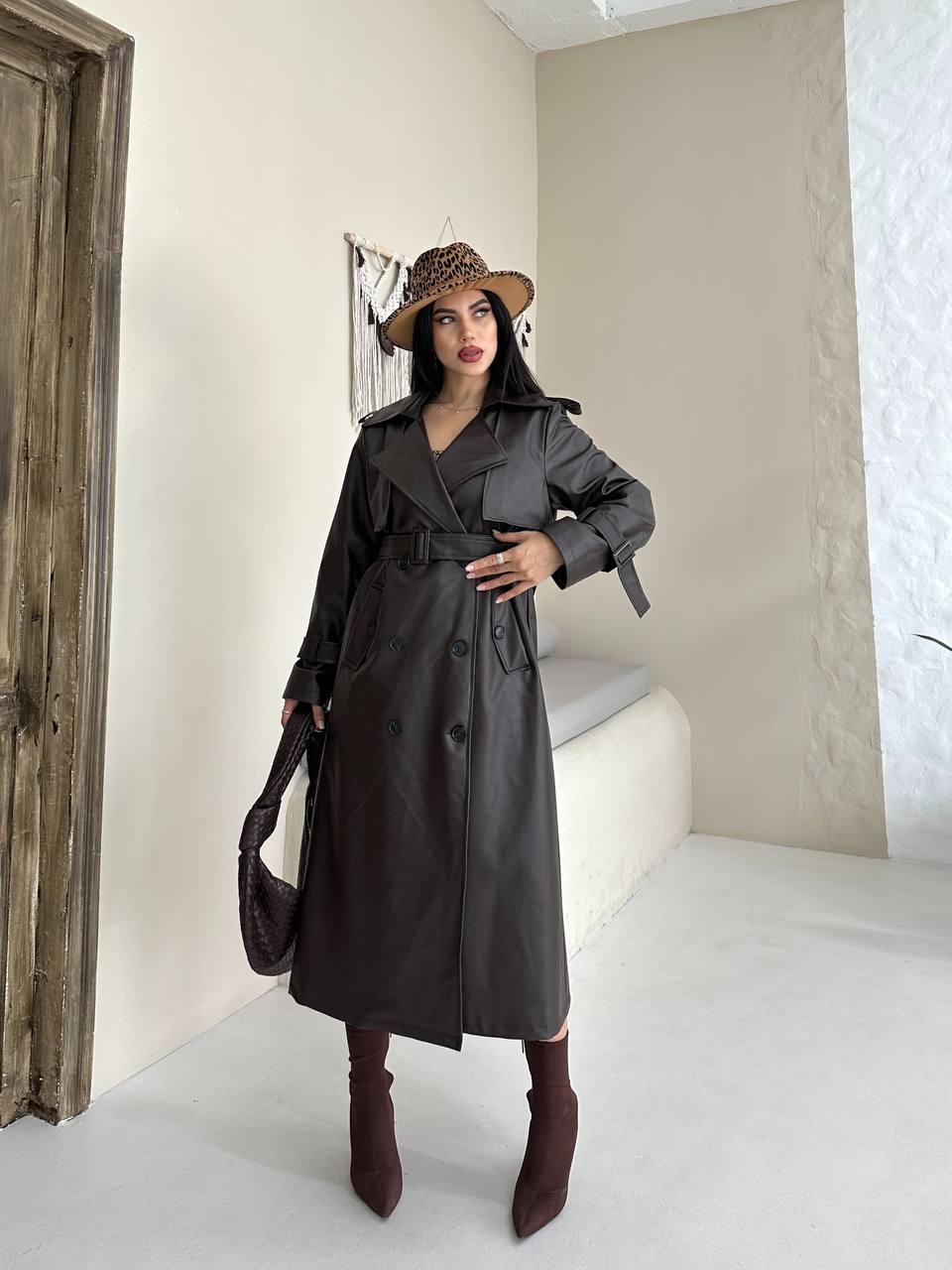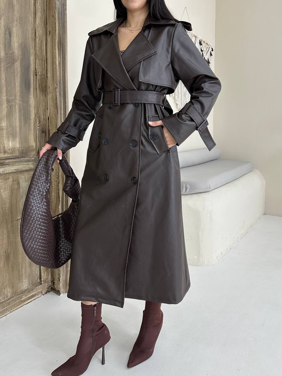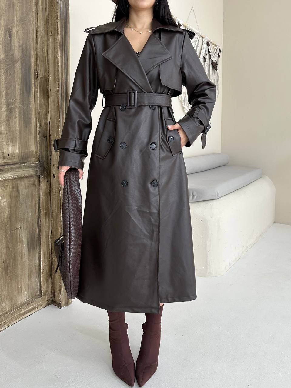 Kadın Klasik Kuşaklı Düğmeli Deri Trençkot