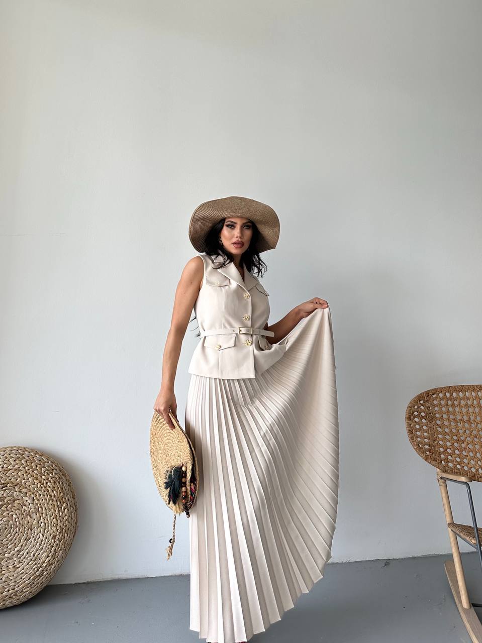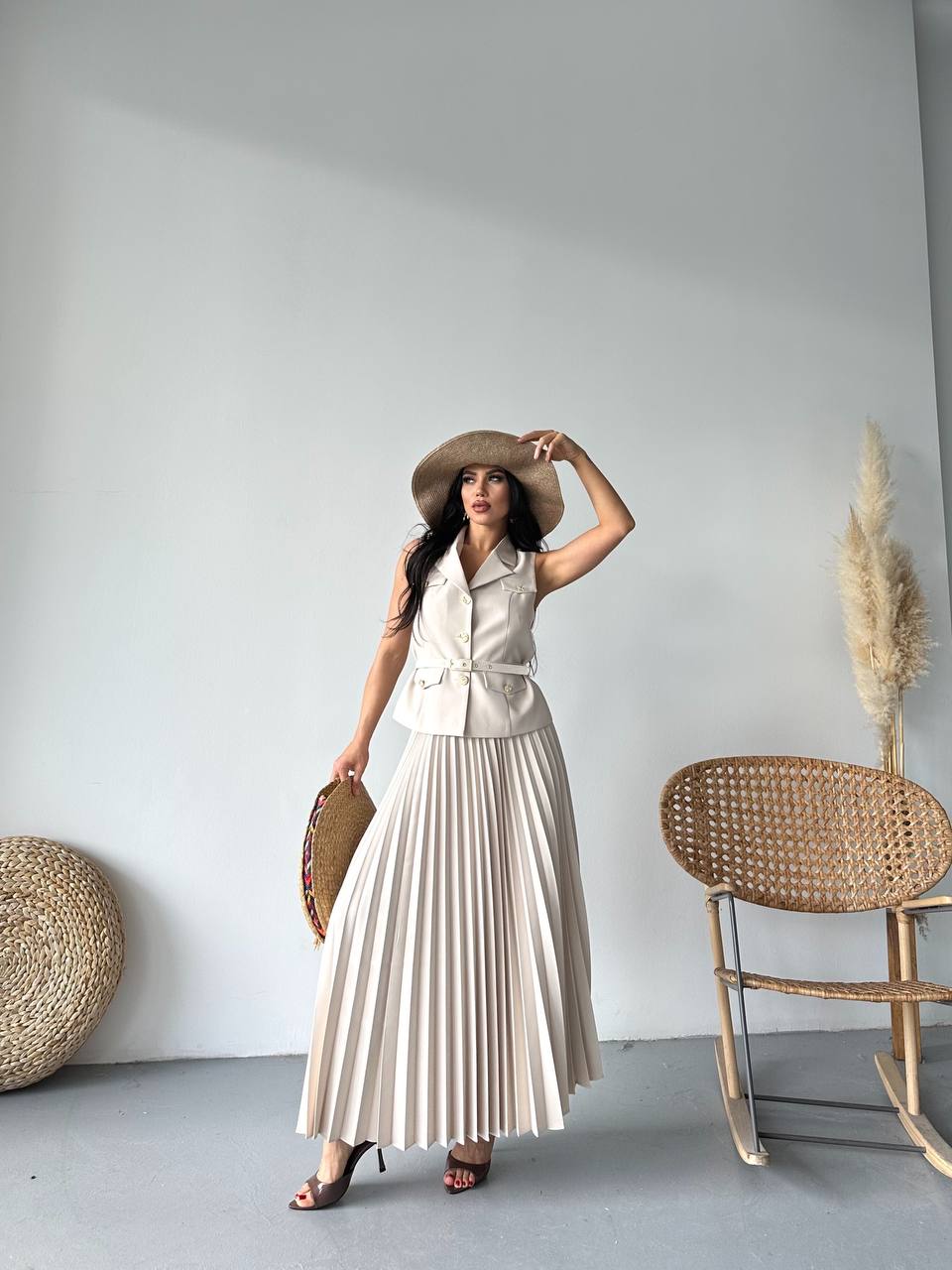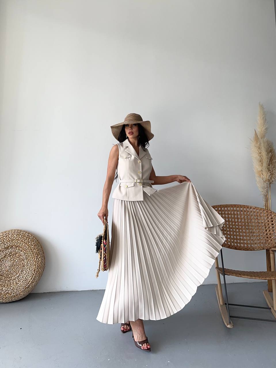 Modern çizgisi ve feminen detaylarıyla dikkat çeken kadın kolsuz pliseli takım, zarif görünümünüze dinamizm katıyor. Hem gündelik şıklık hem de özel davetler için mükemmel bir seçim.