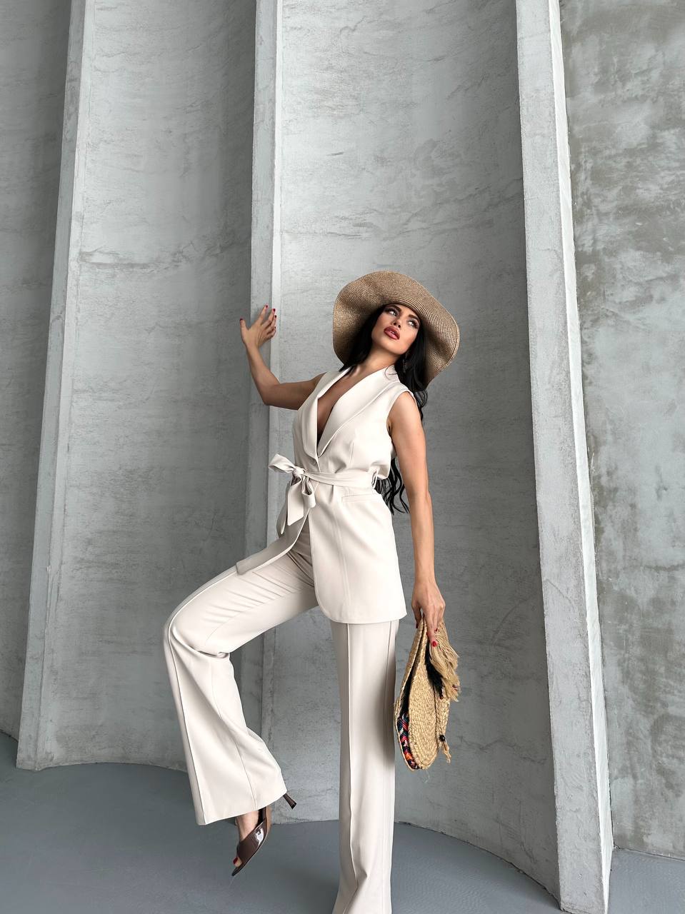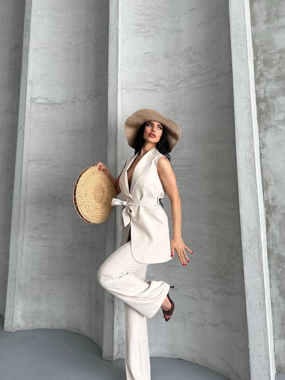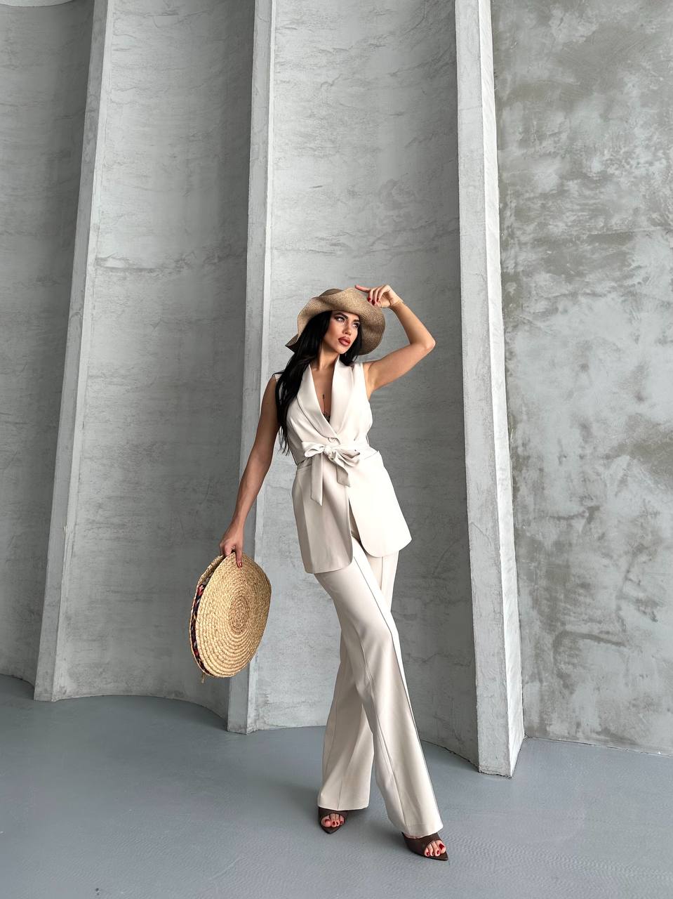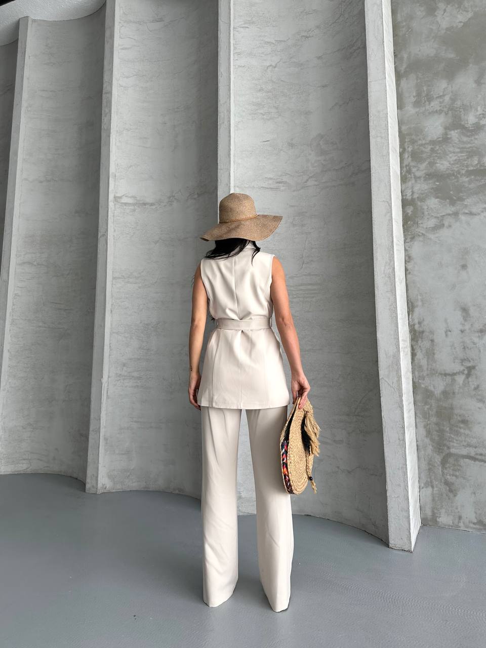 Kadın Kolsuz Kuşaklı Yelek Pantolon İkili Takım