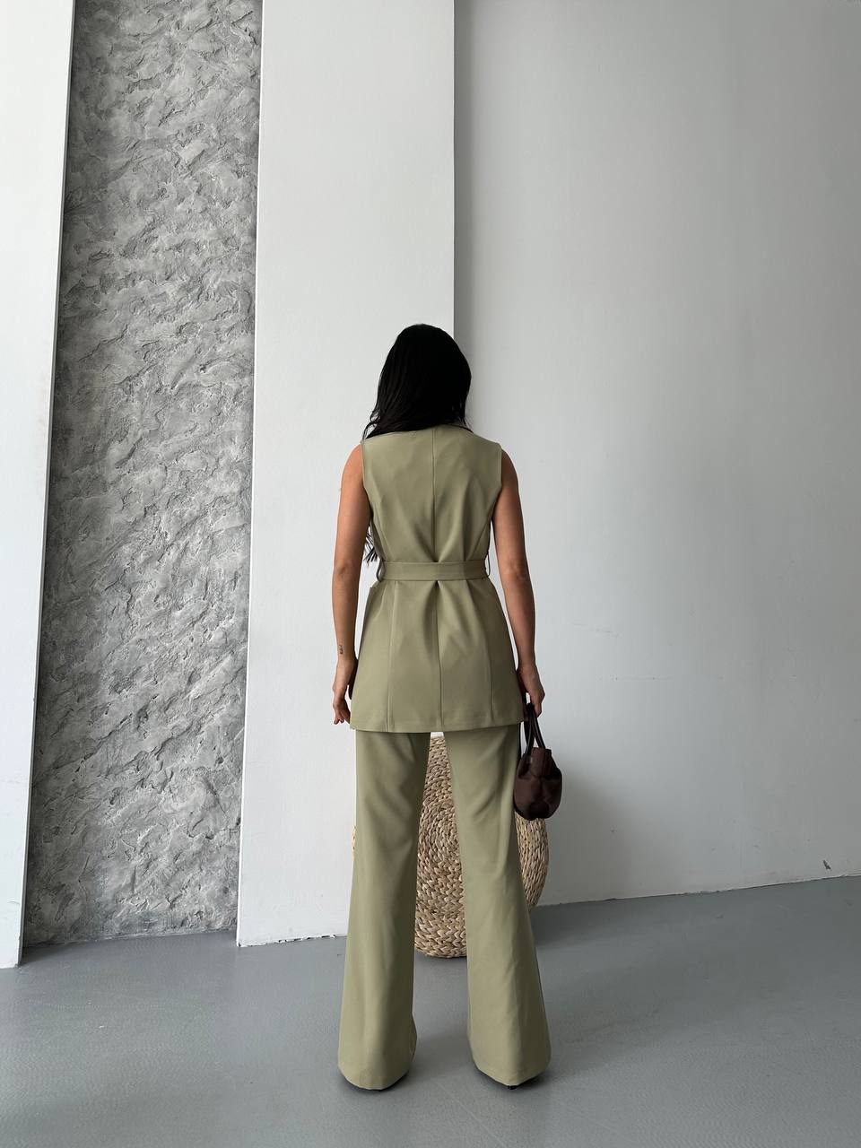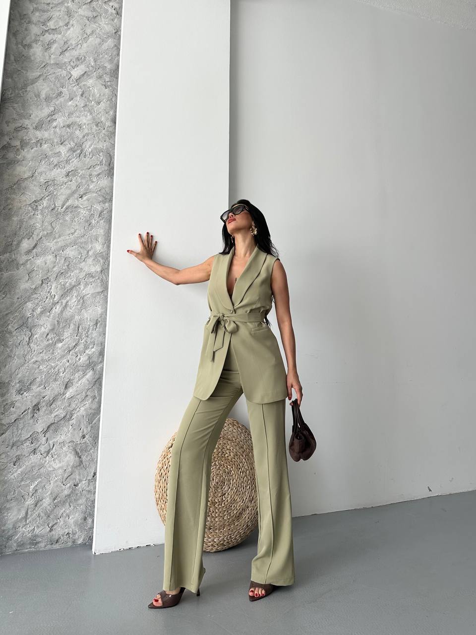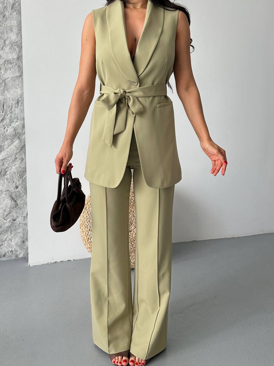 Kadın Kolsuz Kuşaklı Yelek Pantolon İkili Takım