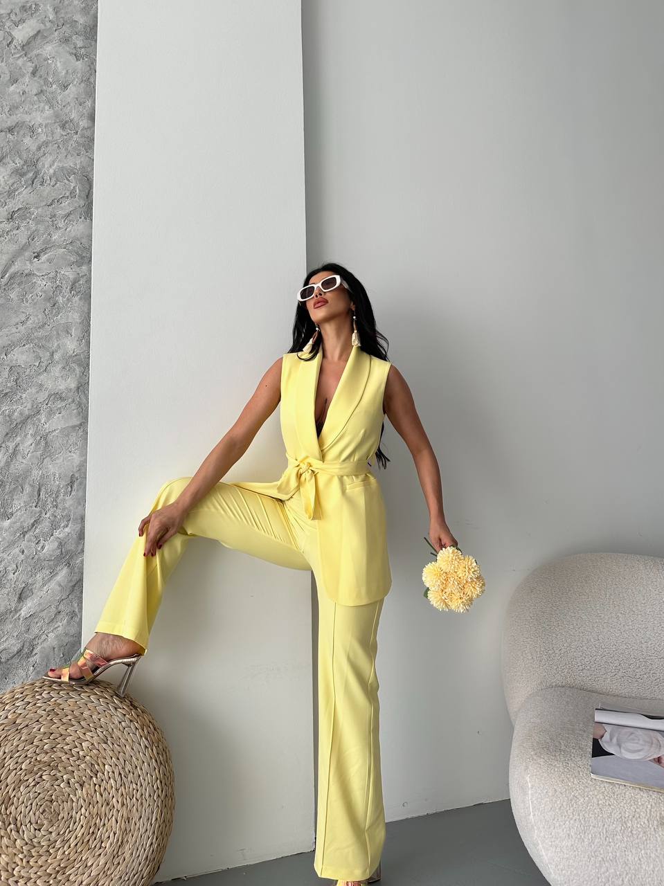 Kadın Kolsuz Kuşaklı Yelek Pantolon İkili Takım