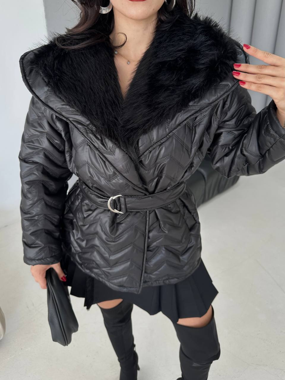 Peluş yakalı, kuşaklı kadın şişme kaban. Sıcak tutan yapısı ve zarif kesimiyle kış stiline modern bir dokunuş katın.