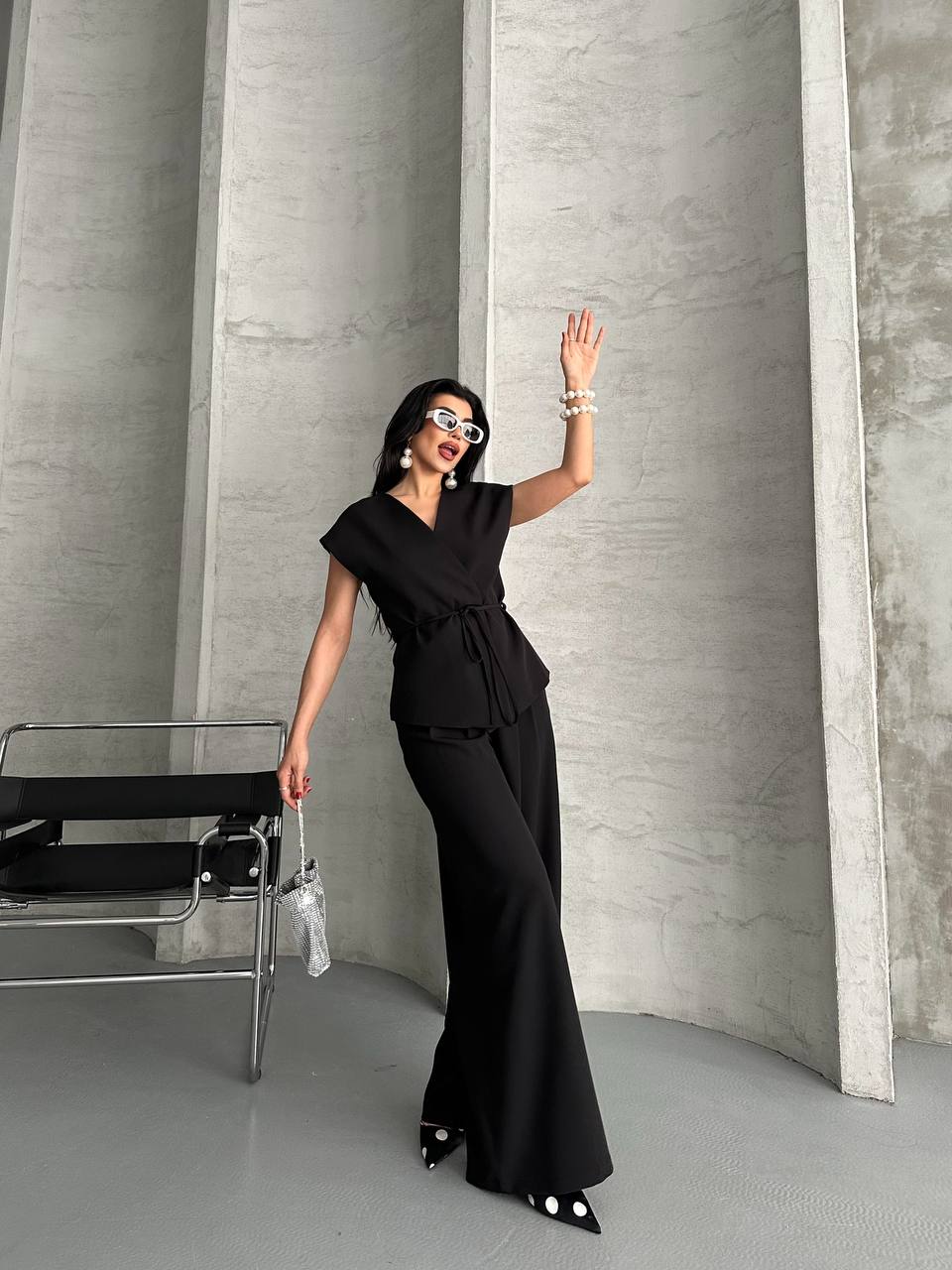 • Bu takım, minimalist tasarımı ve rahat kalıbıyla stilinize modern bir dokunuş katar. Kuşaklı üst, belinizi vurgulayarak zarif bir siluet oluşturur; geniş paça pantolon ise konforlu bir şıklık sağlar.