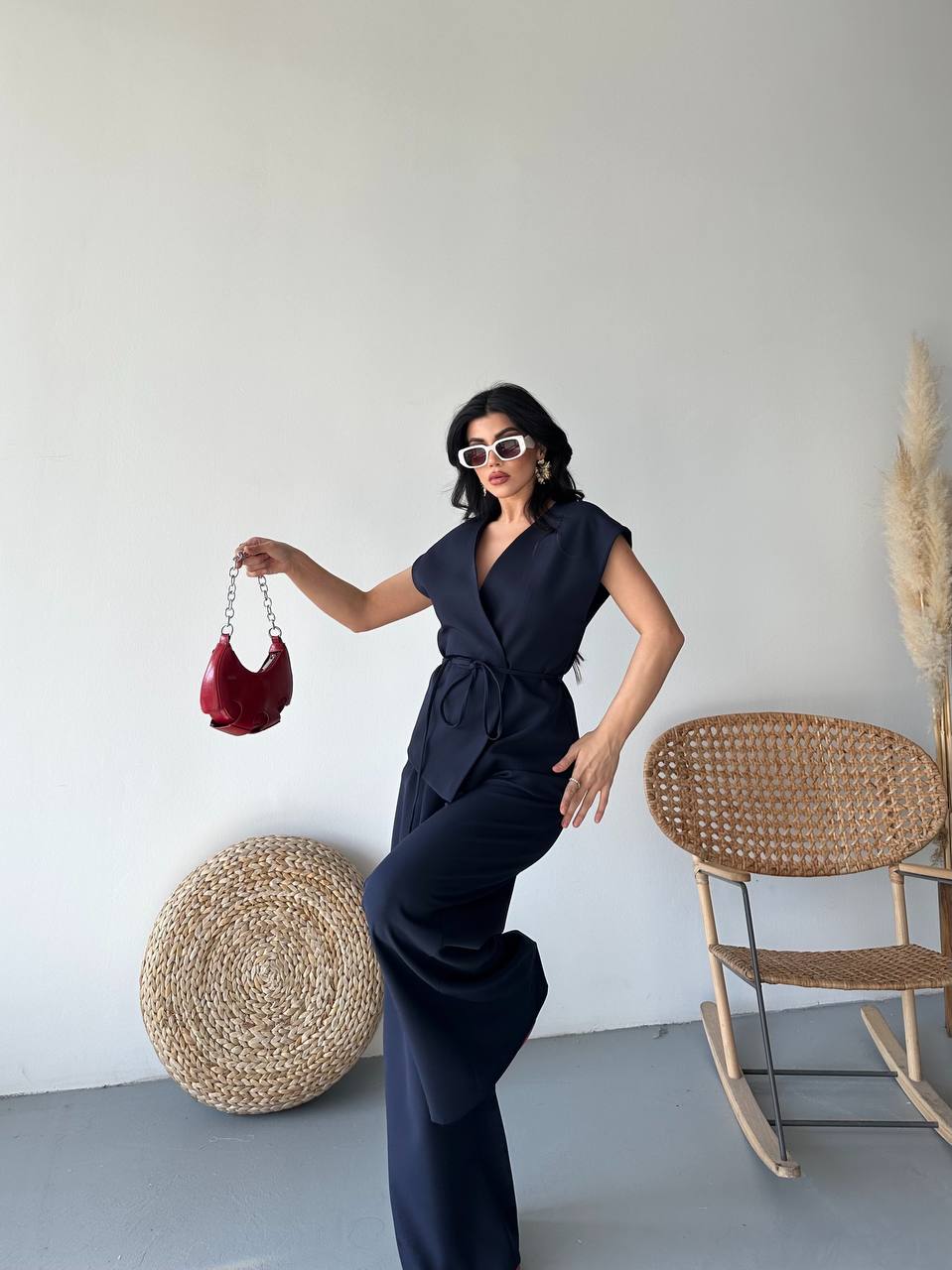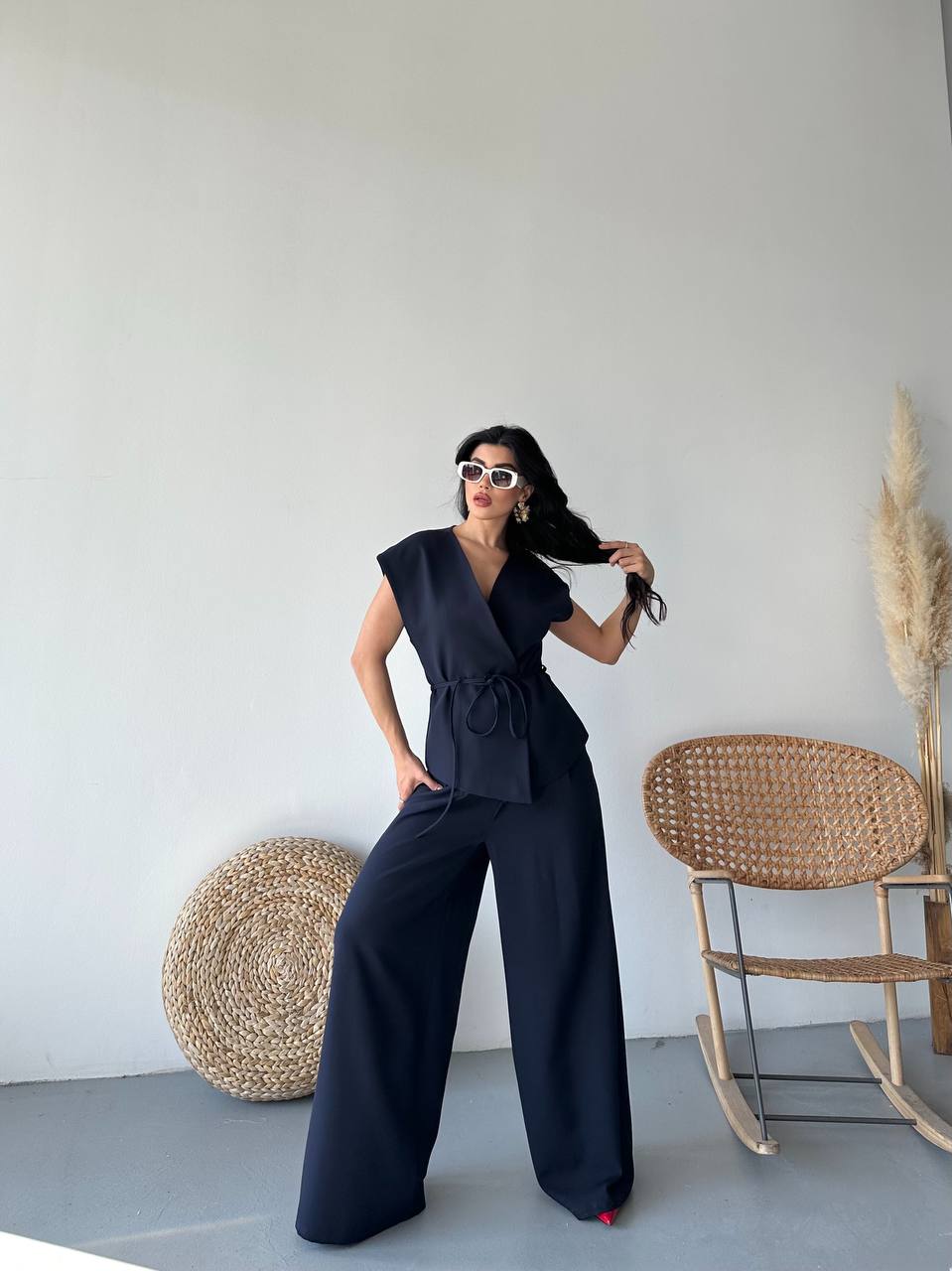 • Modern kesimi ve kuşak detayı ile şıklığı ön plana çıkaran takım. Rahat geniş paça pantolon ve kuşaklı üst ile hem günlük hem özel günler için ideal.