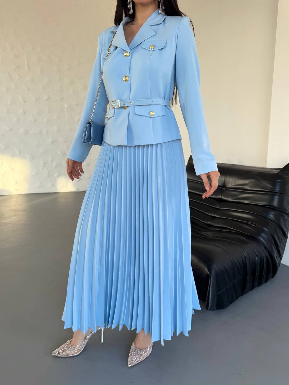 Zamansız şıklığın yeni yorumu! Kuşak detaylı ceketi ve hareketli piliseli eteğiyle öne çıkan bu takım elbise, hem günlük hem özel davet kombinlerinde kusursuz bir duruş sağlar.