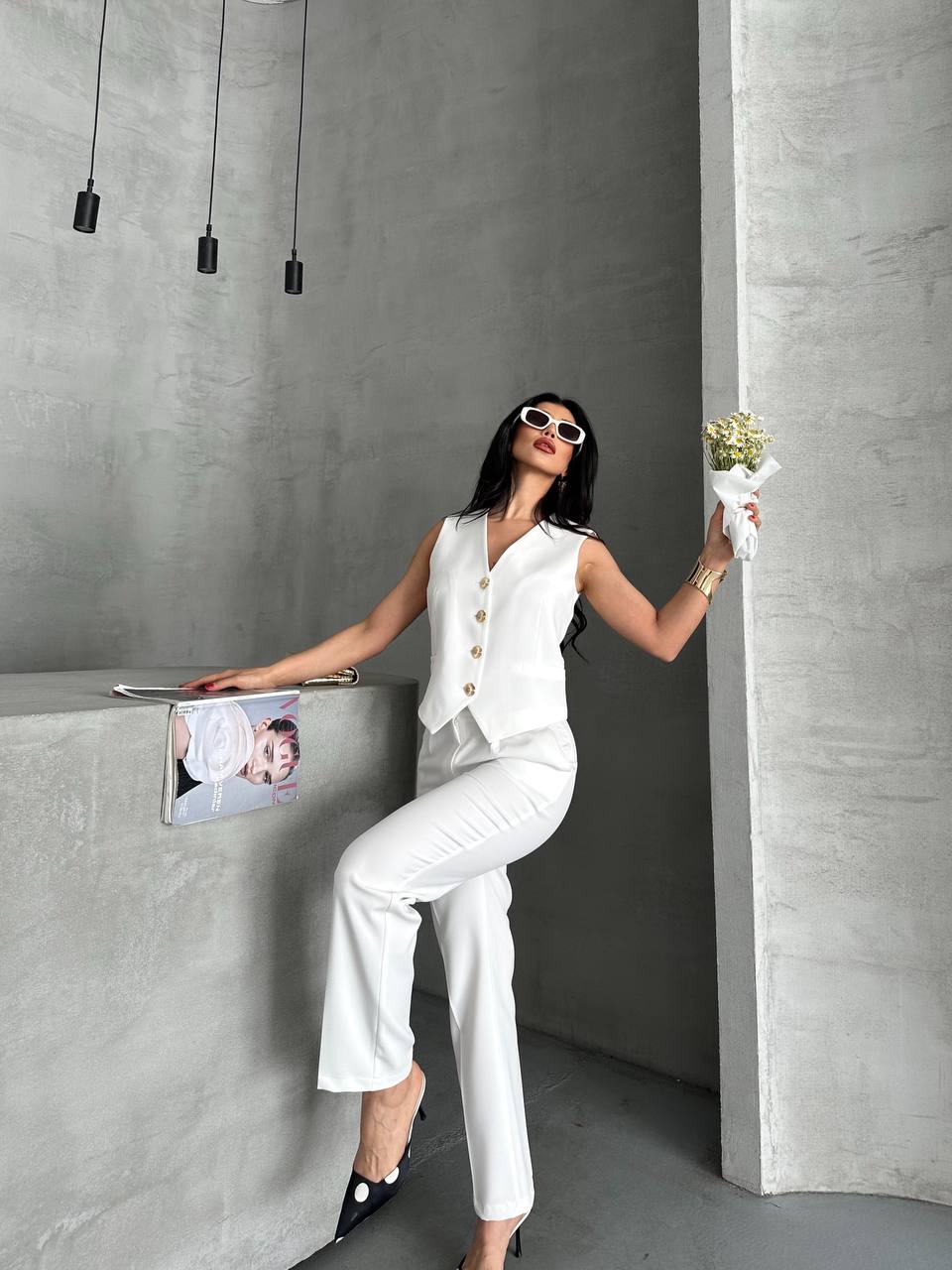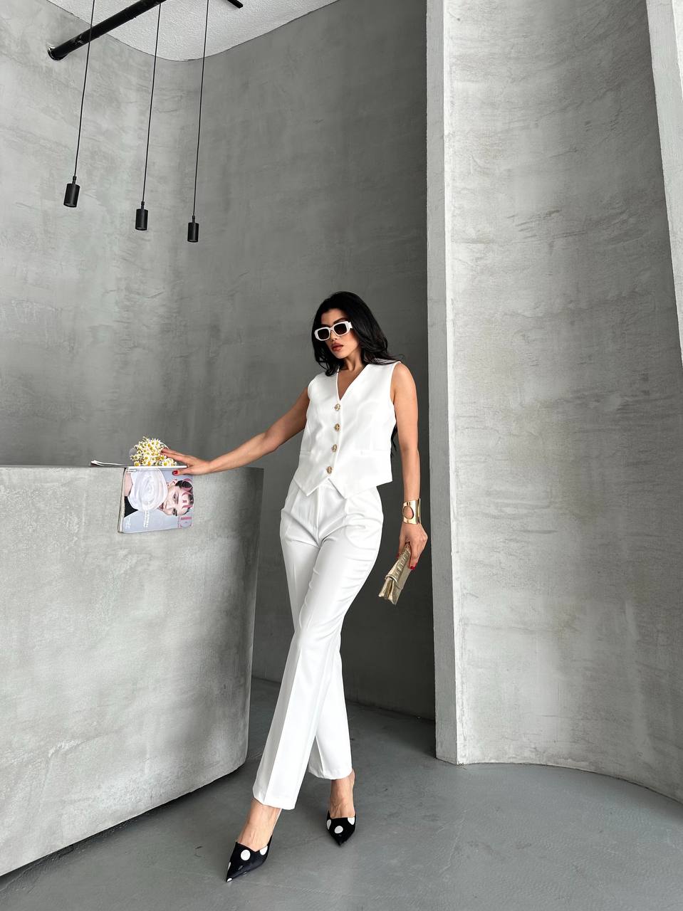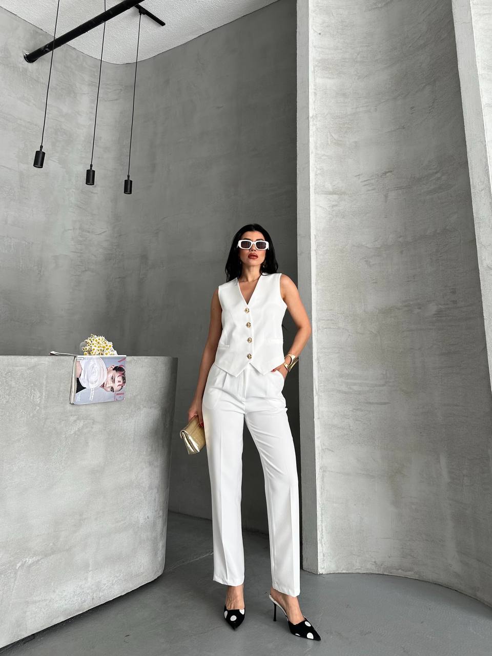 Modern ve şık görünüm sunan bu takım. Altın düğmeli yelek ve düz kesim pantolon ile ofis ve günlük şıklık için ideal bir tercih.