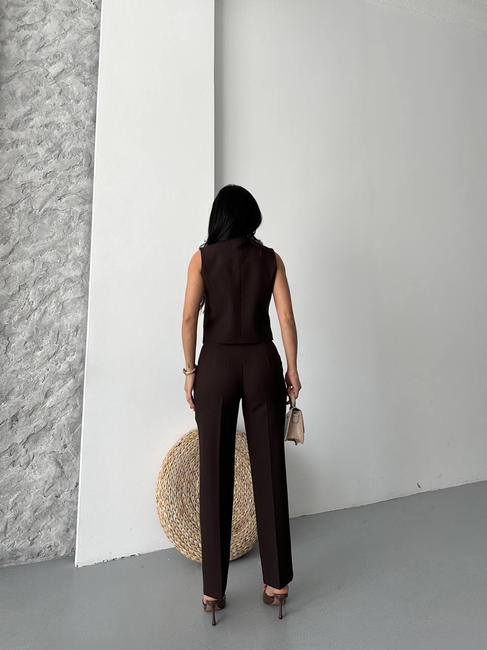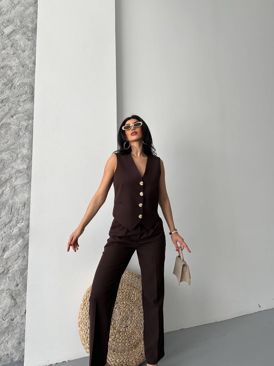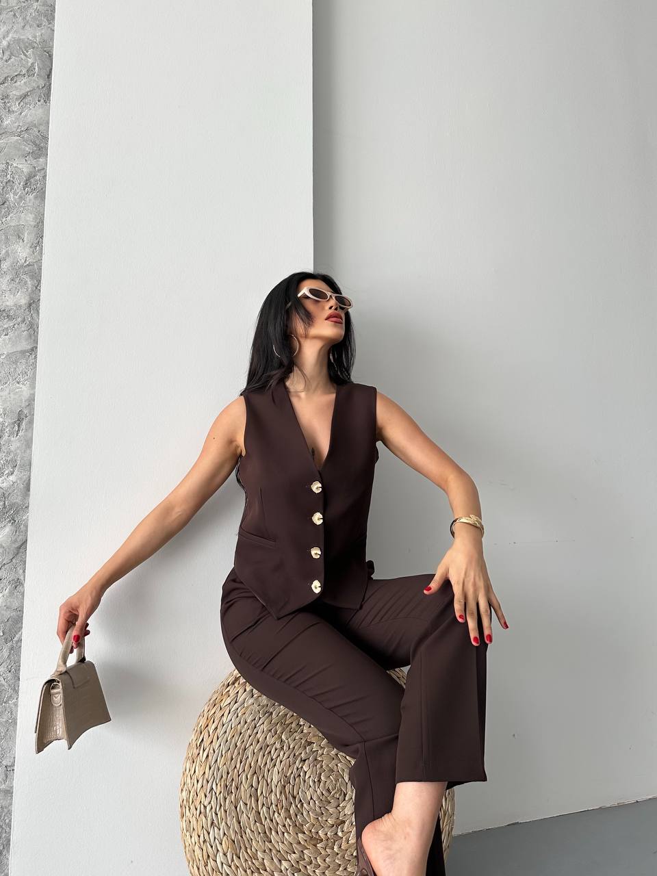 Modern ve şık görünüm sunan bu takım. Altın düğmeli yelek ve düz kesim pantolon ile ofis ve günlük şıklık için ideal bir tercih.