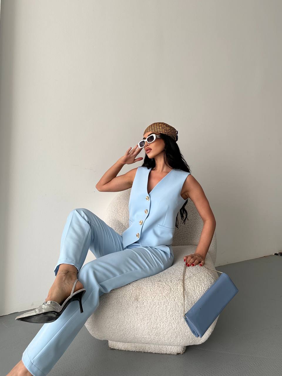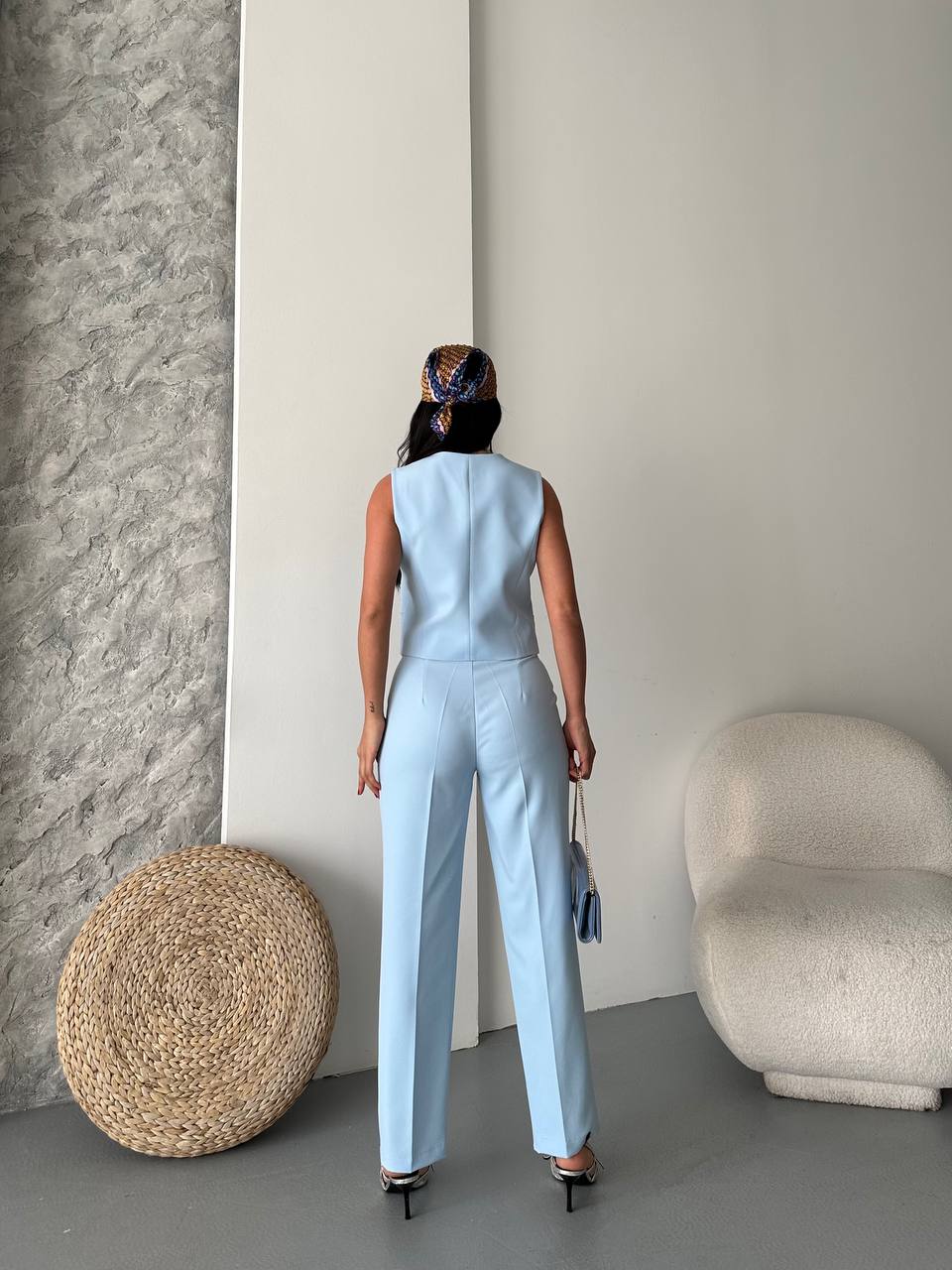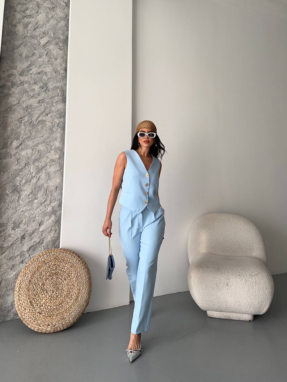 Modern ve şık görünüm sunan bu takım. Altın düğmeli yelek ve düz kesim pantolon ile ofis ve günlük şıklık için ideal bir tercih.