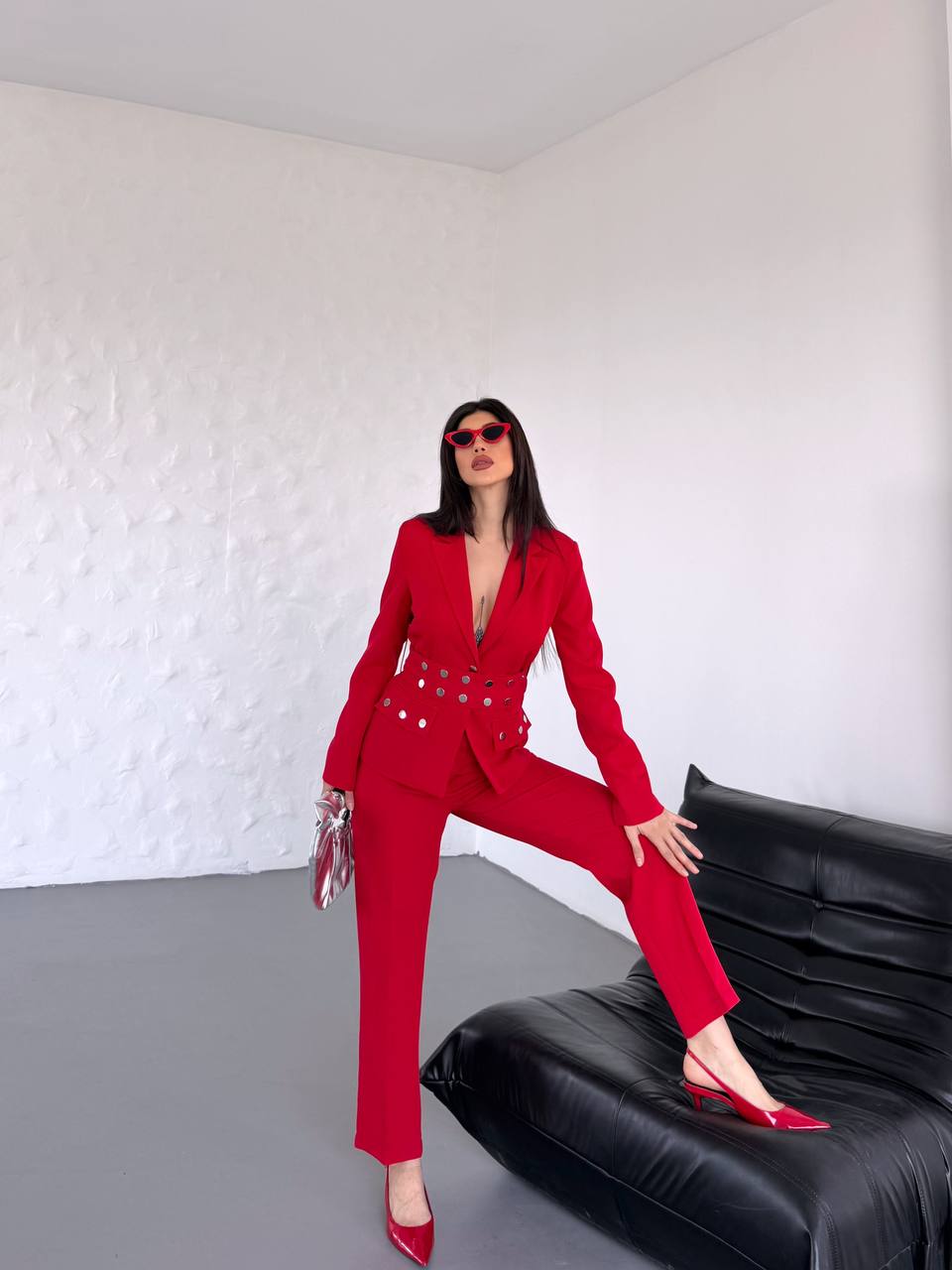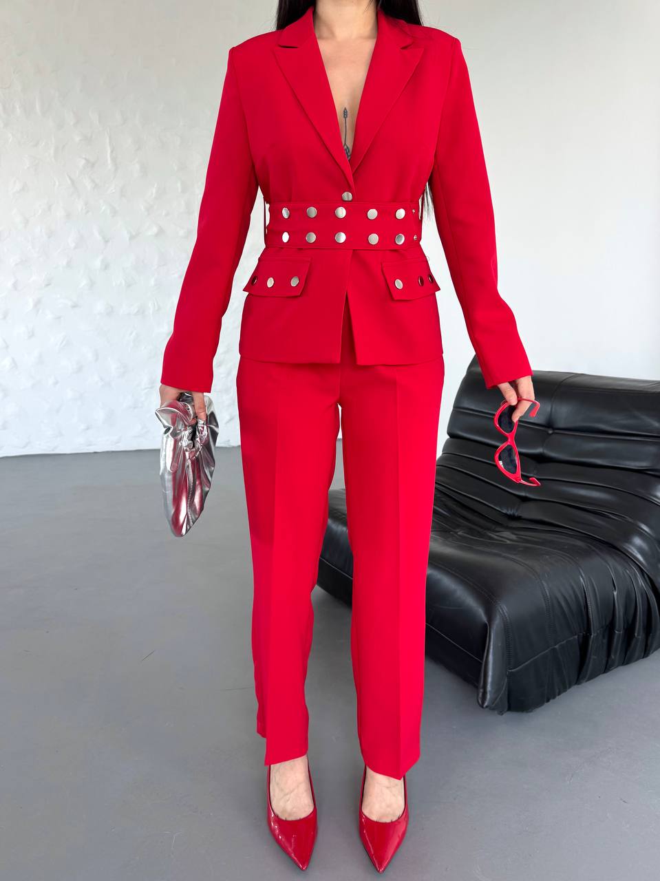 Kadın Zımba Kemerli Ceket ve Pantolon İkili Takım